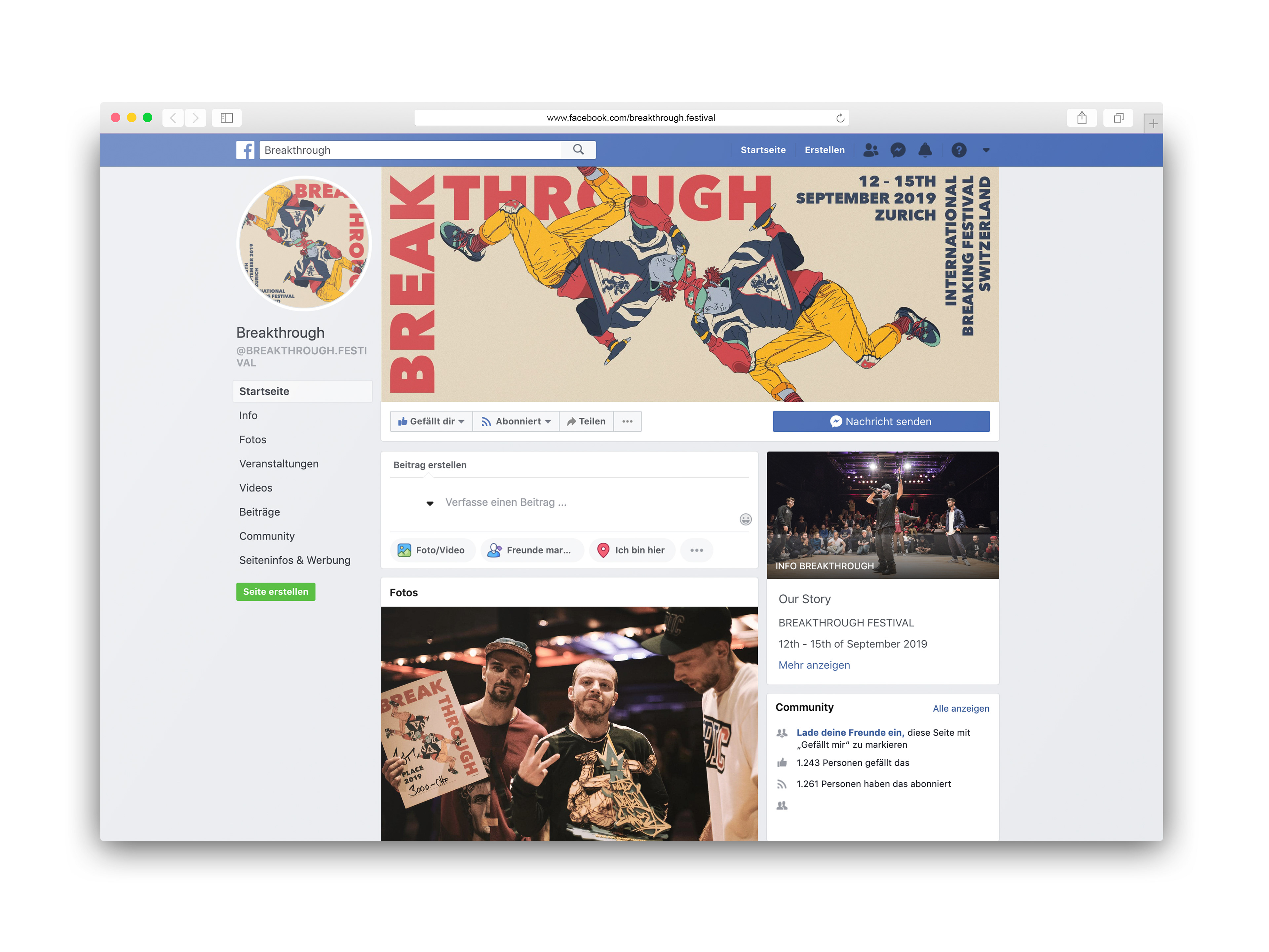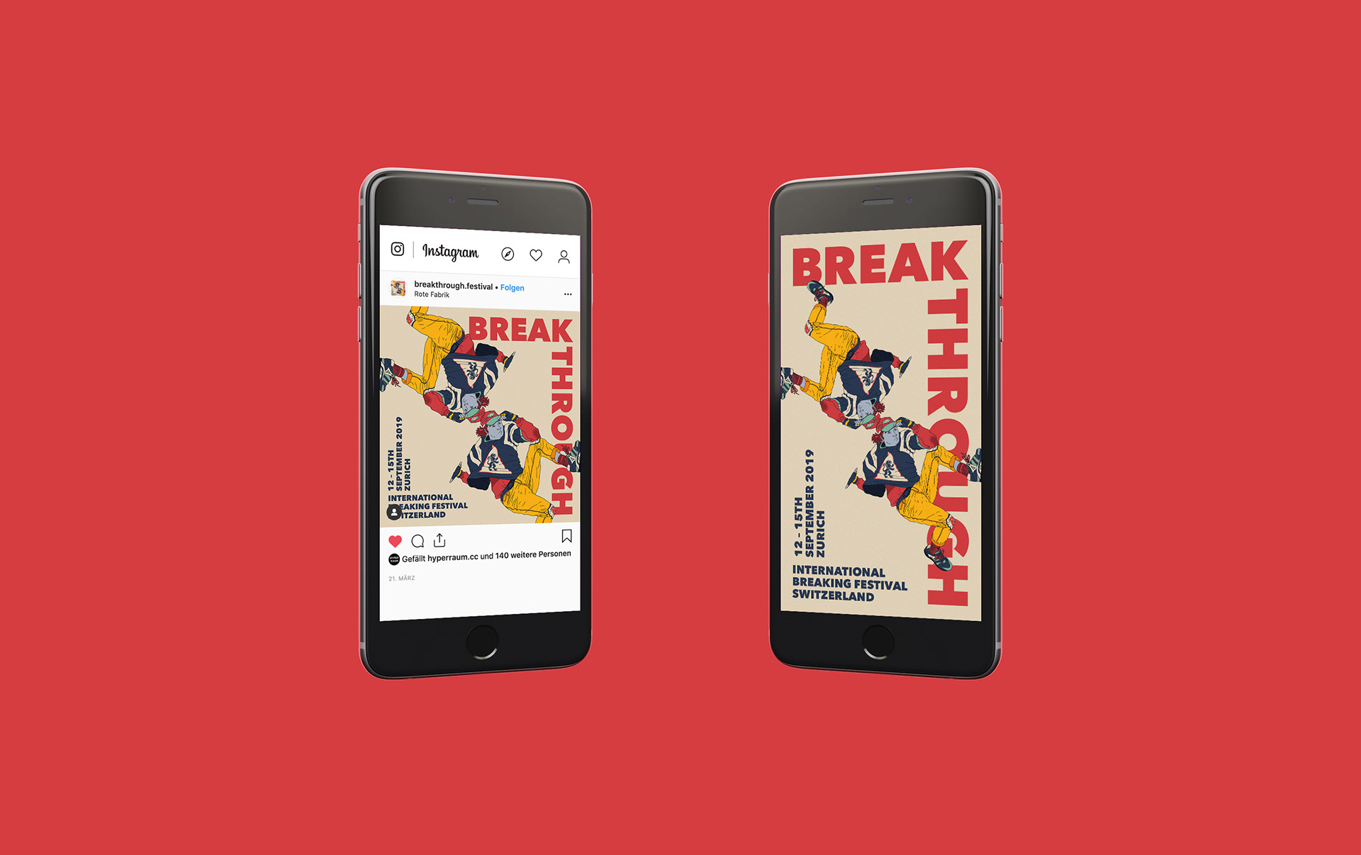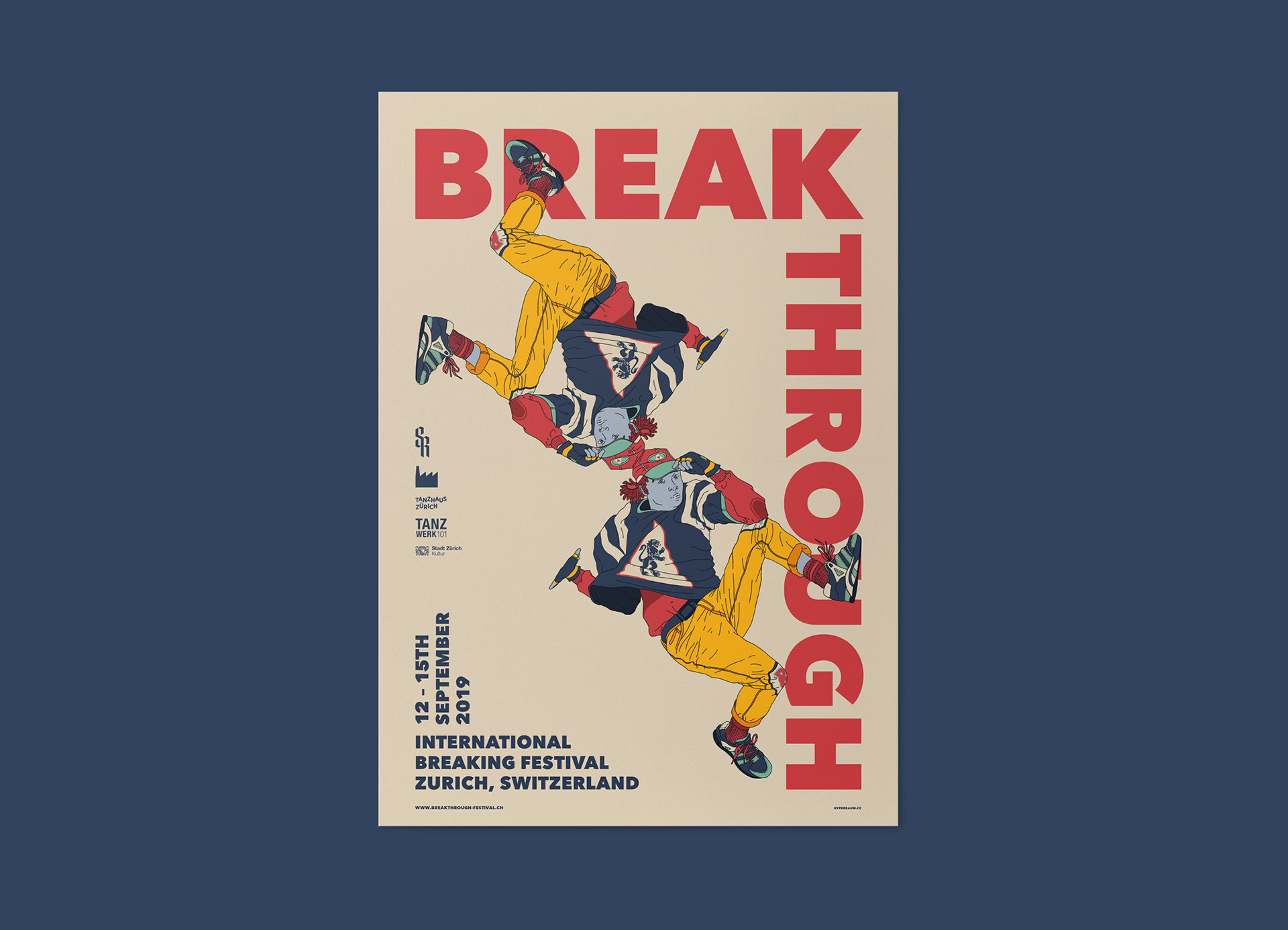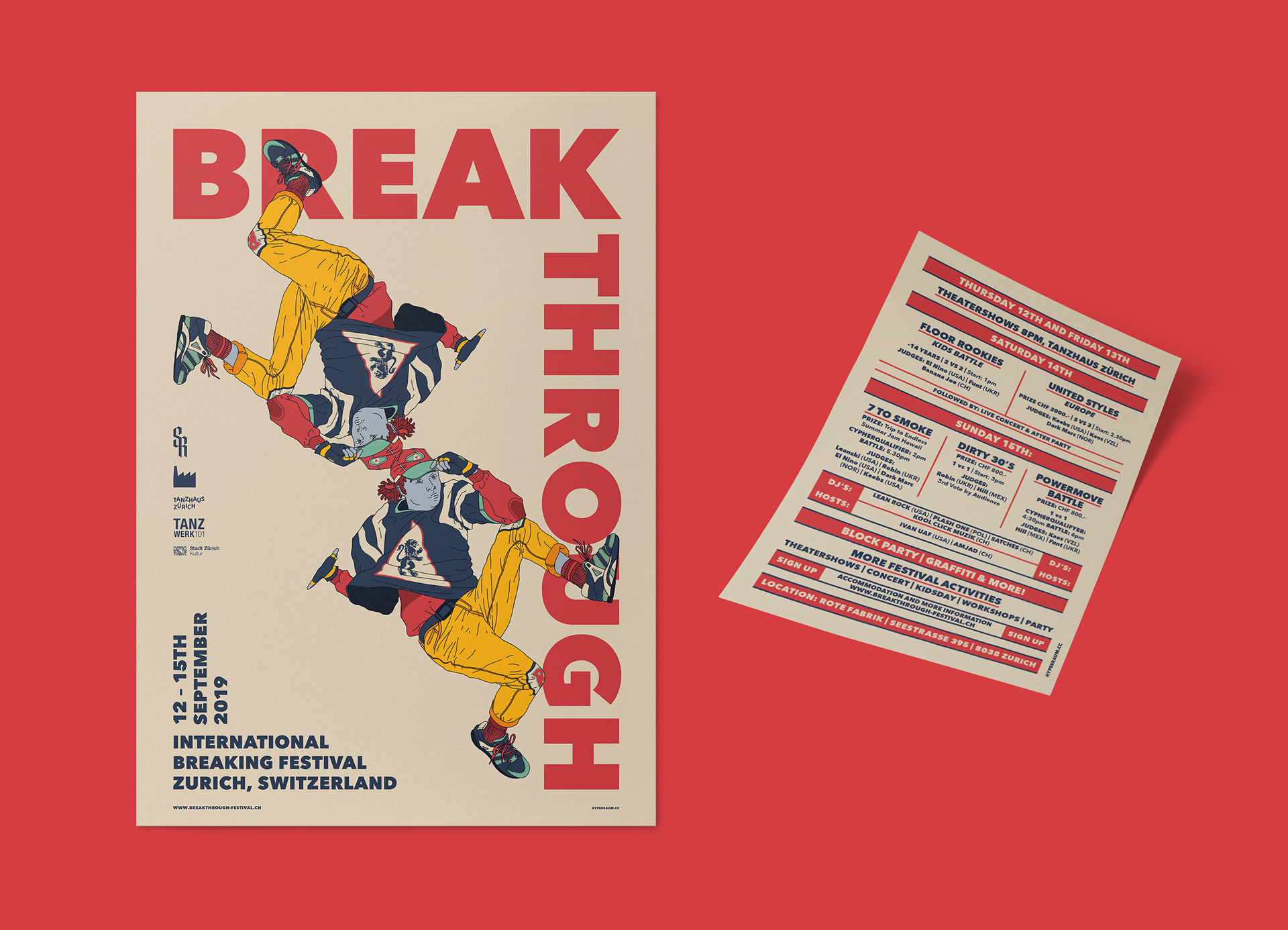 Complete redesign for an international break dance festival in Zurich, 2019. It includes a new concept for a key visual, poster design, flyer design and social media content. www.breakthrough-festival.ch